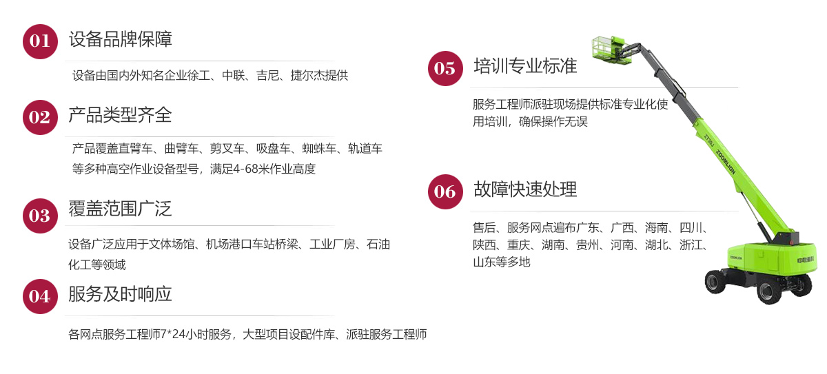 公司在發(fā)展歷程中堅定實行大客戶戰(zhàn)略,致力于以優(yōu)質(zhì)的服務打造公司的品牌和核心競爭力,現(xiàn)已在廣東、廣西、海南、四川、陜西、湖南、重慶、河南、湖北、貴州等多地建立了完善的售后服務網(wǎng)點,24小時為客戶排憂解難。今后我們將結(jié)合市場需求,不斷創(chuàng)新業(yè)務模式、優(yōu)化設(shè)備結(jié)構(gòu)、加強運營管理、擴大服務網(wǎng)點、提升服務水平,形成以設(shè)備租賃、銷售、二手設(shè)備交易等全方位一站式的全面服務體系,用高標準高質(zhì)量的服務讓客戶在和公司合作的過程中實實在在感受到省心、省力、省錢的體驗,在客戶心目中樹立“家鋒”的品牌形象。